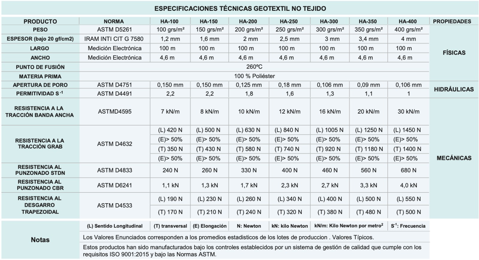 Cumplen las normas ASTM inter­nacio­nales, mecánicas, hidráulicas, físicas, químicas y de UV.  Se ofrecen en diversos gramajes.