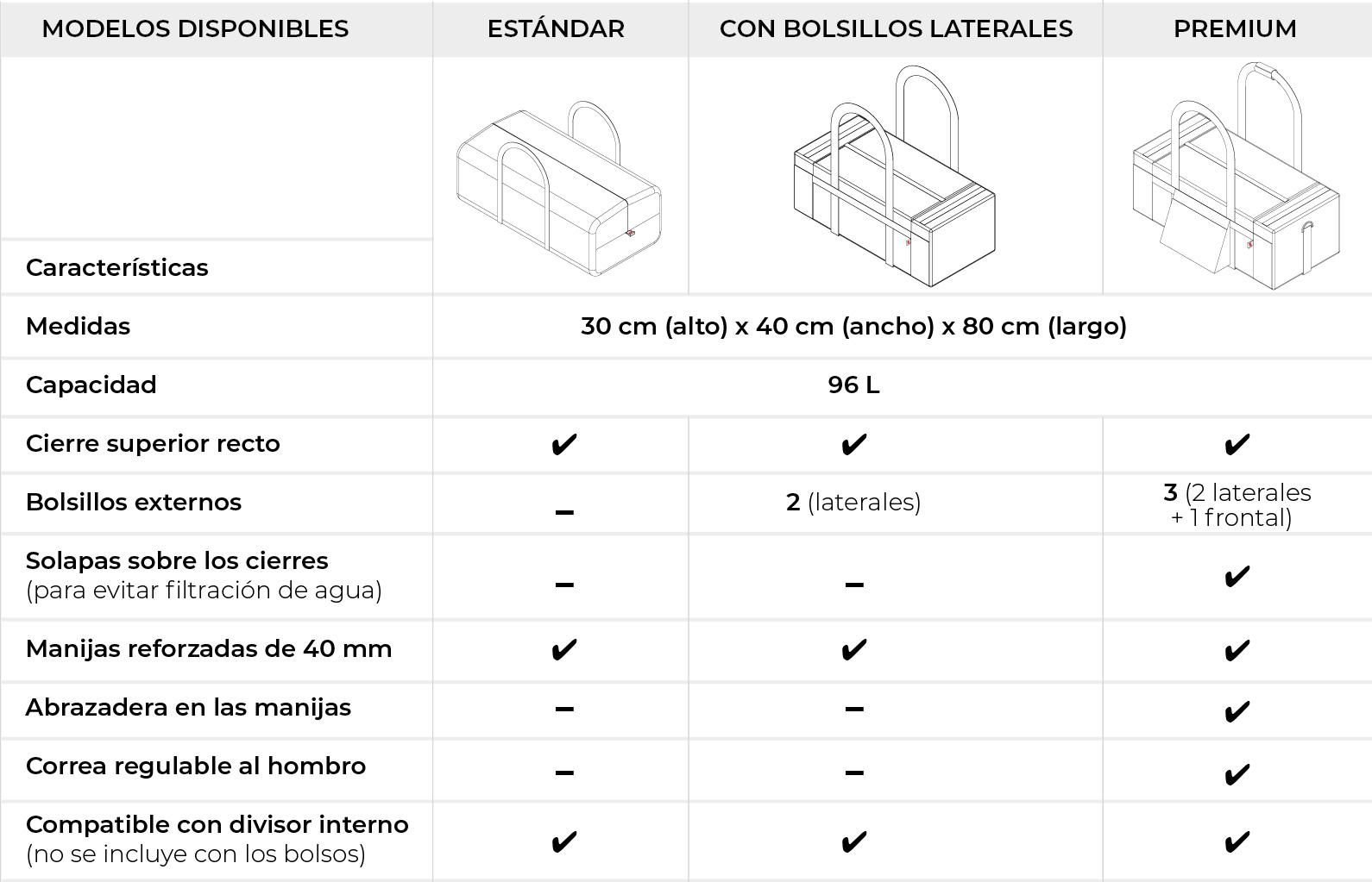 Es un bolso de transporte fabricado en lona PVC impermeable de alta resistencia, pensado para soportar un uso intensivo. Su estructura robusta, costuras reforzadas y diseño funcional permiten transportar distintos tipos de objetos de manera segura y organizada.