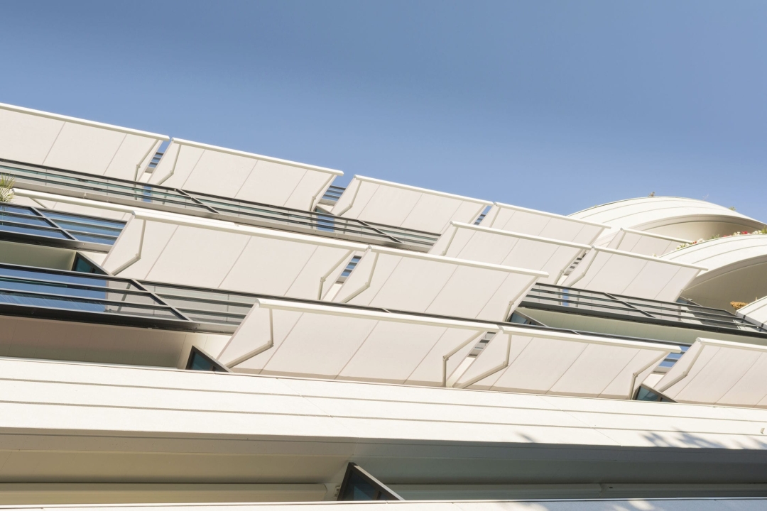 Su concepción recta y elegante permite cubrir grandes áreas con una solución arquitectónicamente estética y exclusiva. Con una estructura fija de fácil montaje, presenta columnas frontales de sostén y guías equipadas con amortiguadores a gas que tensan de forma uniforme el tejido y ojales para la evacuación del agua de la lluvia. Constituye una muy buena protección solar proporcionando un clima fresco y reduciendo el consumo energético por equipos de aire acondicionado, preservando así el medio ambiente.